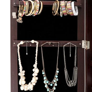 - Ample storage includes 22 necklace hooks, 2 cubes, 3 lined shelves, and a bracelet rod