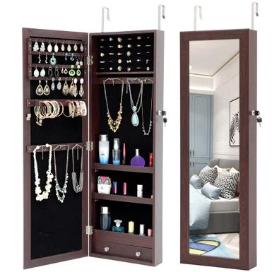 This Jewelry Storage Mirror Cabinet is the perfect solution for organizing your jewelry while also providing a full-length mirror. With luxurious velvet interiors that protect your jewelry from scratches and a secure key lock, your jewelry will stay safe and organized. The cabinet includes 22 necklace hooks, 2 cubes, 3 lined shelves, and a bracelet rod, providing ample storage for all your jewelry needs. Its space-saving design allows it to fit almost anywhere, and it can be easily hung on a door or wall with its durable and easy-to-assemble design.