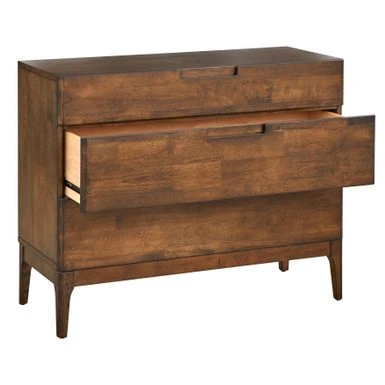 Imbue a little sense of mid-century flair into your space with the charming design of this dresser. Made with rubberwood veneers and dressed in a rich walnut finish, the dresser gives off a rustic, reclaimed look. Three drawers built with full-extension metal glides provide room for clothing, linens and more.