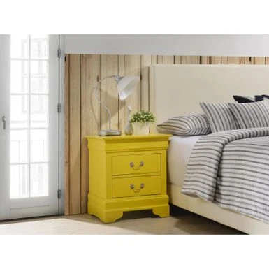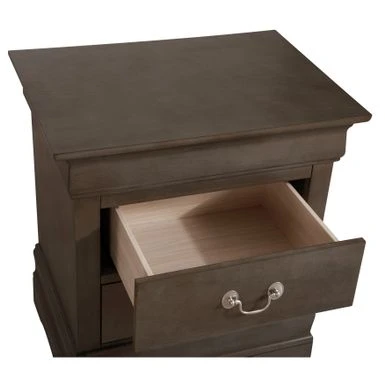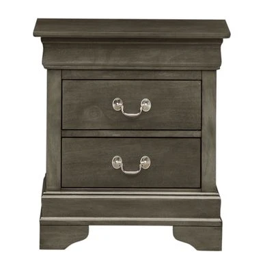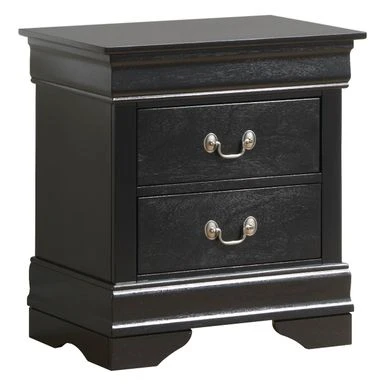 The Glory Furniture Louis Phillipe Two-drawer Wooden Nightstand features beautiful scalloped edges and detailed hardware in a traditional design. This nightstand is made with a wooden frame, manufactured wood and real wood veneers. The drawers move smoothly on solid metal guides and each drawer is made with an English dovetail construction for durability. Corner blocks add generous support to the drawer bottoms. This piece is fully assembled; giving you the opportunity to enjoy the nightstand without complexity.