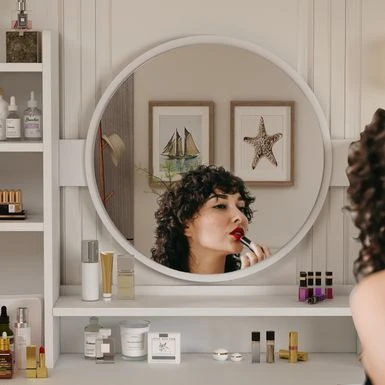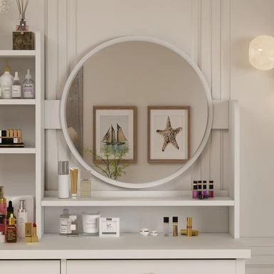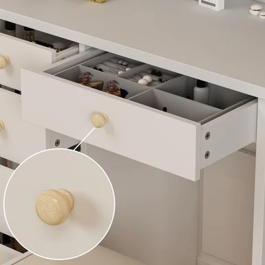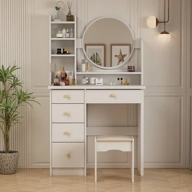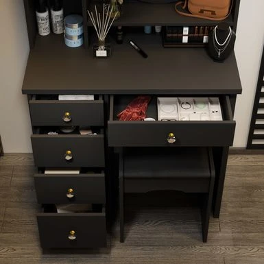 Spacious desktop, open shelf, and 4 large drawers to store cosmetics, skincare products, and accessories.