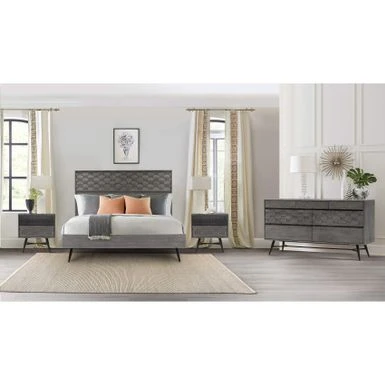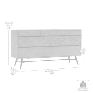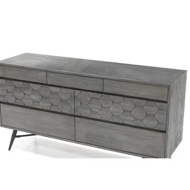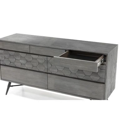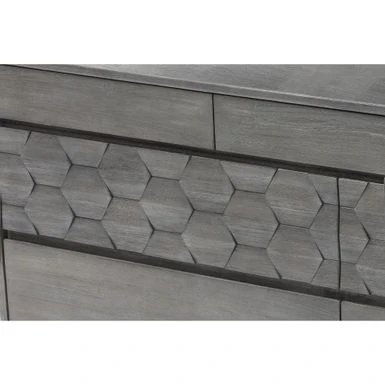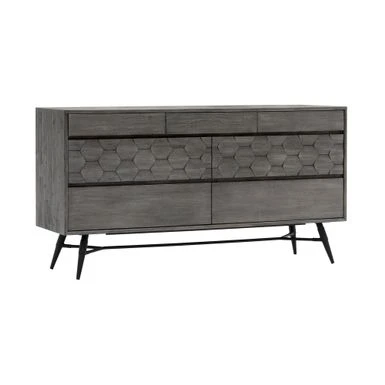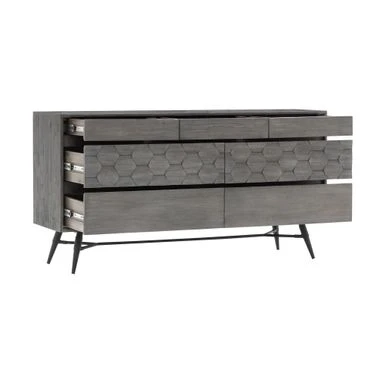 Add stylish storage to your bedroom with a Makena six-drawer dresser in grey Acacia wood. The sleek facade of our dresser is enlivened with a three-dimensional honeycomb pattern. Add stylish storage to your bedroom with a Makena six-drawer dresser in grey Acacia wood. The sleek facade of our dresser is enlivened with a three-dimensional honeycomb pattern. Bringing playful elegance to your bedroom, the dresser showcases the natural grains of Acacia in a charming grey finish. Acacia wood is a popular choice for furniture because it has many advantages over other types of hardwood. The strength-to-weight ratio of acacia wood is one of the best in the world, making it perfect for furniture that needs to be lightweight but still durable. It is resistant to moisture and pests and does not warp. If you are looking for a durable, long-lasting material for your furniture, then acacia wood is worth considering. Our modern and graceful dresser is elevated upon a sleek metallic base to uplift your modern aesthetic. Easily accommodate storage needs in your primary bedroom, guest room, entry way, or home office. The Makena features a beautiful tundra grey finish and includes six roomy drawers to keep all your workout gear, pajamas, and other essentials organized for a clutter-free storage solution.