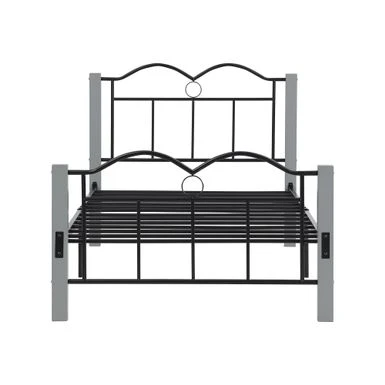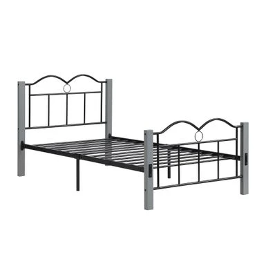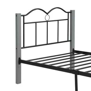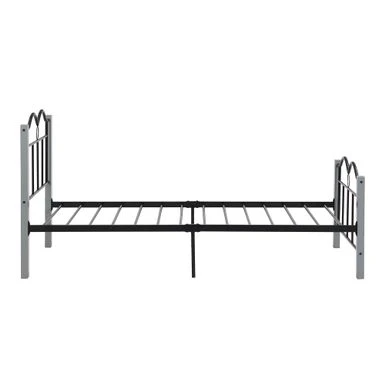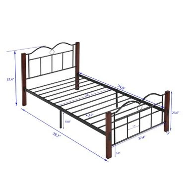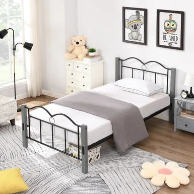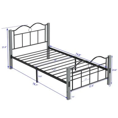 The Metal Twin Platform Bed has everything you need in the heart of your bedroom. The sturdy, bold metal frame and rich woodgrain finish give it a clean and handsome look that will complement your style: whether rustic, industrial, minimal or somewhere in between! The bed features a tall black metal frame and metal slatted base to support your foam, latex or box spring mattress without box springs. Made from a metal frame and designed with whimsical curves and refined details, it’s perfect for any bedroom, guest room or even a teenage bedroom. The secure metal slat system not only allows air to pass freely under the bed to ensure your mattress stays fresher for longer. You can dress it up with a colorful duvet, some blankets and throw pillows, or use neutral styles and shades that allow traditional metallic details to stand out and take center stage. This sturdy metal bed frame promises to provide a peaceful and welcoming space for years to come!Â