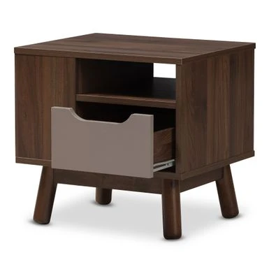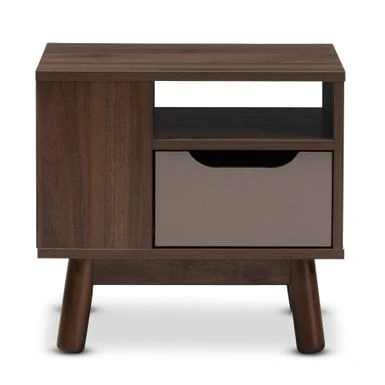 Keep everything you need for comfortable sleeping or lounging close at hand with this Baxton Studio mid-century nightstand beside your bed. Two open shelves hold books and electronics, and the spacious drawer is great for personal care items. Keep everything you need for comfortable sleeping or lounging close at hand with this Baxton Studio mid-century nightstand beside your bed. Two open shelves hold books and electronics, and the spacious drawer is great for personal care items. The two-tone walnut and grey finish lends a cool retro look to your bedroom.