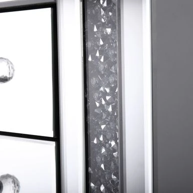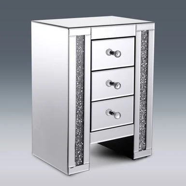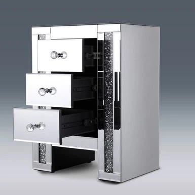 Add a touch of glamour to your bedroom with this stunning mirrored nightstand featuring three drawers. The crushed crystal design gives it a modern and elegant look, making it the perfect addition to any stylish bedroom. The smooth tabletop allows for displaying of lamps, books, and other bedside essentials with ease.