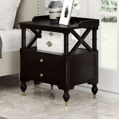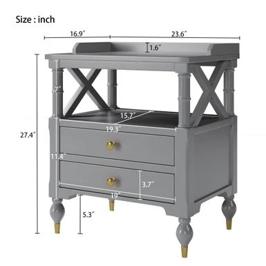 - 1. The gray finish of this 2 Drawer Nightstand is offset by the Antique finished gold metal handles, giving this nightstand a stylish look that will remain a sense for years.