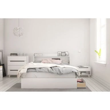 The high in style and practical Aura Collection from Nexera has modern lines creating a welcoming and trendy bedroom set Assemble a stylish oasis with this white bedroom set from Nexera. The platform storage bed and bookcase headboard provide space to store personal belongings for a neat, uncluttered room. A matching four-drawer chest and nightstand expand your storage capacity and unite your decor, creating a chic minimalist look.