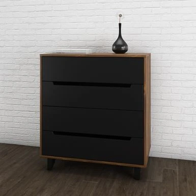 The Nexera Nocce 4 Drawer Chest in Truffle with Carved Matte Black Drawer Fronts and Legs is a stylish and functional storage solution for your clothes and personal belongings. With four convenient storage drawers, this chest offers ample space to keep your things organized. The quality metal slides ensure smooth and easy drawer operation, while the signature drawer front and carved legs with a white matte lacquer finish add a touch of elegance. The combination of matte black lacquer and truffle finish gives this chest a modern and sophisticated look.