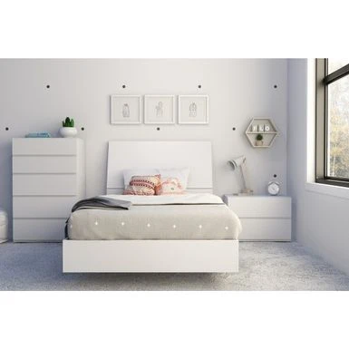 The Paris platform bed with matching headboard bundle is the ideal start point for any modern bedroom. With it’s all-white finish and pure lines, Paris is a bedroom collection where it feels good to relax and unwind. The Paris platform bed with matching headboard bundle is the ideal start point for any modern bedroom. With it’s all-white finish and pure lines, Paris is a bedroom collection where it feels good to relax and unwind. The platform beds unique design gives the impression the it floats above the ground, giving the entire room an airy feel. This bed also features a unique metal and hardwood slat construction allowing for easy assembly, sturdy construction and easier handling. White melamine finish Unique design gives the impression the bed floats above the ground, giving the entire room an airy feel Features a unique metal and hardwood slat construction allowing for easy assembly, sturdy construction and easier handling Headboard features 2 lateral storage sections Fits a standard size mattress No box spring required Twin bed has a 300 pound weight capacity Full and Queen bed have a 500 pound weight capacity