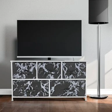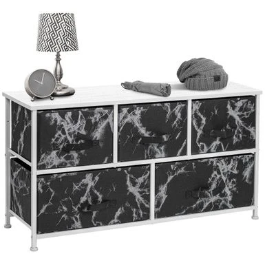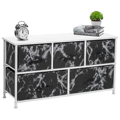 Add a touch of luxury to your bedroom or hallway with the Porch & Den Andrea Black Marble Fabric/ White Wood 5-drawer Dresser. Fashionable and functional, this dresser features a unique marble pattern that adds texture to any space. Organize your clothes, linens, and accessories in style with the breathable, non-woven fabric drawers that are easy to open and close with the soft fabric pull handles. The lightweight and portable design makes it easy to move and store when not in use. Pair it with other pieces from the Sorbus Furniture Collection for a cohesive look.