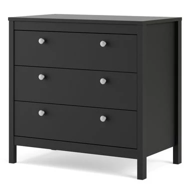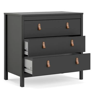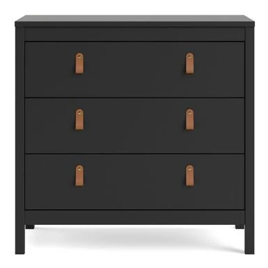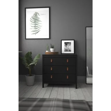 Add a touch of modern-traditional flair to your bedroom or small space with the Porch & Den Madrid 3 Drawer Chest. This functional and stylish chest offers ample storage with three drawers that retract smoothly on metal glides with built-in safety stops. The Madrid Chest features a durable foil surface that is easy to clean and comes with two types of handles-grey knobs and brown leather handles-to customize the look. With steel brackets adding support to the bottom of drawers, this chest is built to last. Combine with other pieces from the Porch & Den Madrid collection to complete your bedroom space.