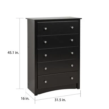 Add contemporary flair to your home with this stylish 5-drawer chest. With a black laminate finish and brushed nickel knobs, this chest boasts a unique and elegant look. The wooden drawers feature metal glides with built-in safety stops for easy handling of bulkier items. Equipped with a tipping restraint for enhanced stability, this chest is suitable for children’s rooms.