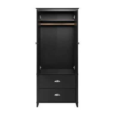 Organize your clothing with ease using the Prepac Yaletown 2-Door Armoire. This stylish armoire features six-way adjustable hinges, allowing for easy accessibility to the wooden hanging rod and upper shelf. The two large drawers below provide ample space for folded clothes, while the brushed nickel pulls and knobs add a touch of sophistication. Made with durable laminate and non-toxic, CARB-2 compliant materials, this armoire is as sturdy as it is safe.
