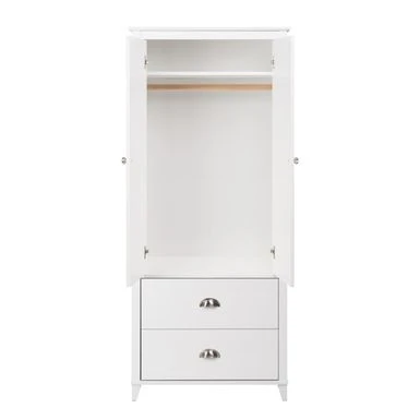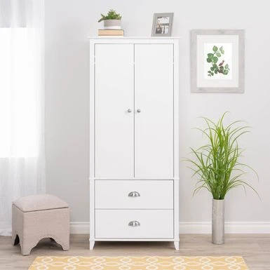 Organize your clothing with ease using the Prepac Yaletown 2-Door Armoire. This stylish armoire features six-way adjustable hinges, allowing for easy accessibility to the wooden hanging rod and upper shelf. The two large drawers below provide ample space for folded clothes, while the brushed nickel pulls and knobs add a touch of sophistication. Made with durable laminate and non-toxic, CARB-2 compliant materials, this armoire is as sturdy as it is safe.