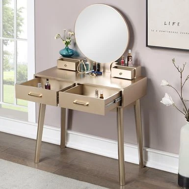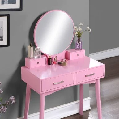 - The vanity features round mirror and tapered legs. The drawers sit on metal glide with metal drawer pull