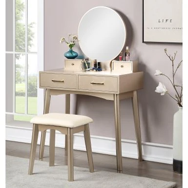 - Simple, modern style which fits to a variety of room decors. The set includes the vanity table, mirror, and the matching stool