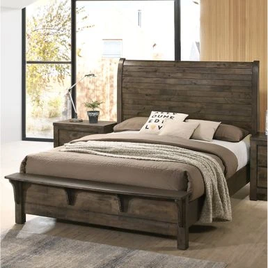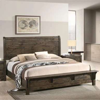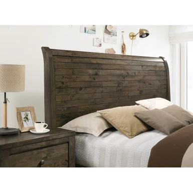 - Rustic, Country style. Natural wood grain. Ample storage space with drawers and shelves. Featuring beautiful wood plank details on the sleigh headboard.