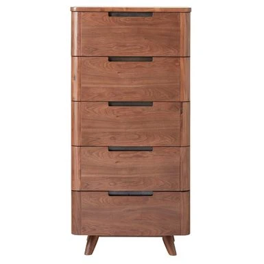 Introducing the Kirkwood American Walnut Mid Century Modern 5-Drawer Lingerie Chest, an elegant storage solution for your bedroom. Crafted by hand with solid and veneered American walnut wood, this piece boasts a warm walnut finish that provides a stunning contrast in materials. The curved framing of each case piece is perfectly accented by soft mitered handles and features soft-close mechanisms on the drawers for quiet and sure closure. With its signature tapered legs, this chest is a classic mid-century masterpiece that adds style to your space.