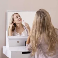 White Wooden Mirror Vanity Desk Makeup Table – 31.5 X 19.7 X 34.3 – White