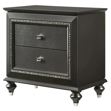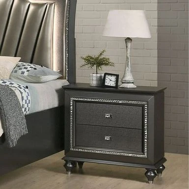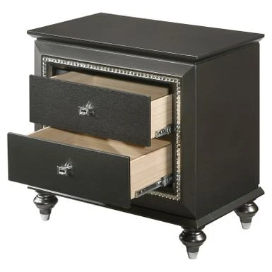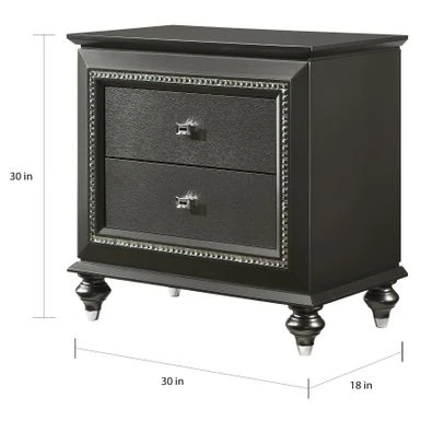 The nightstand provides a commanding presence in any room. This contemporary nightstand in metallic gray finish features 2 storage drawers and crystal-like sparkling trim. Crafted with a glam look that is an ideal addition to any bedroom.