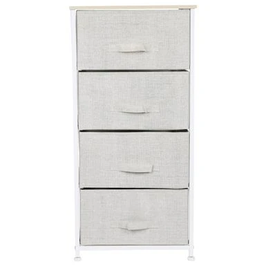 Add extra storage space to any room with the Simplify 4 Drawer Storage Chest in Beige. This versatile storage solution features four non-woven drawers and a work top surface, providing ample space to organize your belongings. The durable steel frame ensures stability and sturdiness.