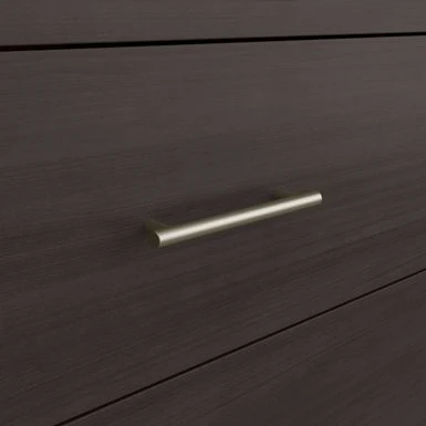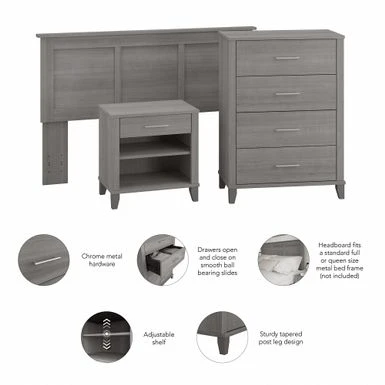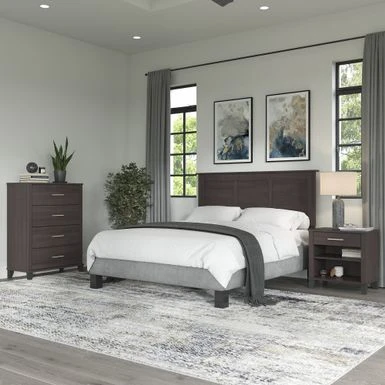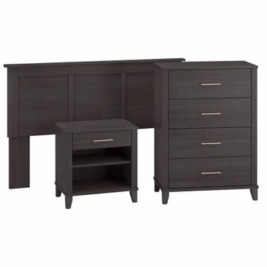 Create a relaxing atmosphere in your personal sanctuary with the dependable yet soothing Bush Furniture Somerset Full/Queen Size Headboard, Chest of Drawers and Nightstand Bedroom Set. Organize clothing inside vertical dresser drawers that have been tested with a 70 lb. weight to surpass industry standards for stability on hard and carpeted flooring. The innovative Open-Safe mechanism prevents more than one drawer from extending at a time, and a wall anchor is included for even more security. The Headboard attaches to a standard queen or full-size metal bed frame (not included) with two settings to accommodate various mattress heights. Its sturdy construction and wear-resistant finish allow you to lean back with confidence as you scroll through your phone, check the news on your laptop or get lost in a good book. The Nightstand features one box drawer and two shelves to ensure that personal supplies and reading materials are never out of reach. The bottom shelf is fixed for stability, and the upper shelf can be adjusted to store larger items. Somerset’s transitional styling includes tapered legs, contemporary metal hardware, and your choice of four elegant finishes: Ash Gray, Fresh Walnut, Platinum Gray and Storm Gray. This bedroom furniture set has been meticulously designed and tested with your safety in mind and is backed by a 6 Year Manufacturer’s Warranty. See the full Somerset Collection for coordinating items available.