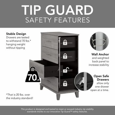 - Tip Guard(TM) safety features include a stable design, counterweighted back panel, wall anchor and Open-Safe Drawers