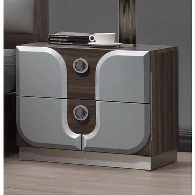 Give your bedroom a modern flair with this Somette Manchester two-drawer nightstand featuring a chrome and zebra-wood finish for a minimalist look. The blue mirror handle adds a little retro charm to the piece.