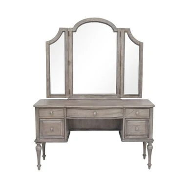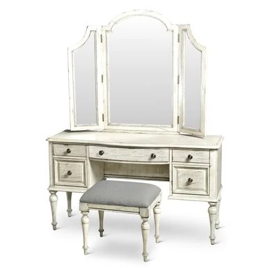 Elegant vintage farmhouse style is displayed in this vanity desk set with charming arched and hinged mirror, vanity desk, and stool with gorgeous turned legs and finished in your choice of distressed rustic driftwood or ivory. Five drawers for storage and beautiful turned legs add to the classic charm of this set.