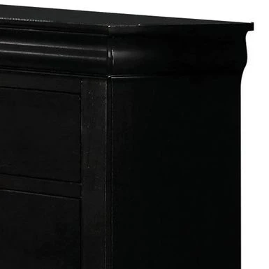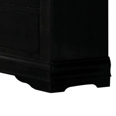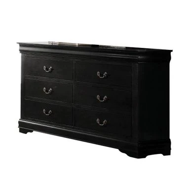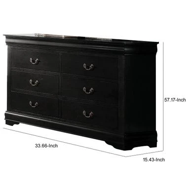 Add a touch of vintage charm to your bedroom with this Traditional Style Wooden Dresser. Crafted from select veneers and hardwood solids in a sleek black finish, this spacious six-drawer dresser provides ample storage space for all your foldable apparel. Adorned with antique bronze color bail hardware, shaped molding, and bracket feet, this dresser exudes a relaxed yet timeless style that complements any decor.