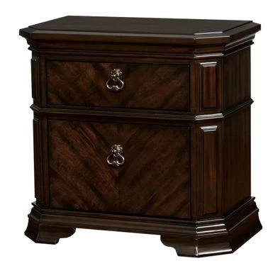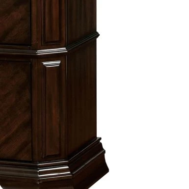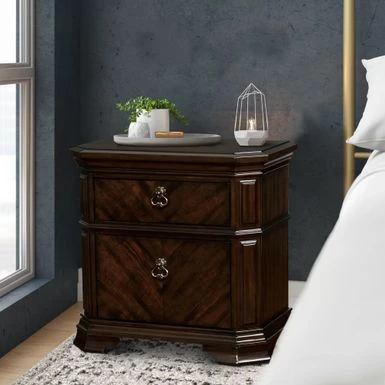 Add a touch of artistry and craftsmanship to your bedroom with this unique two drawer nightstand. Crafted from solid wood and veneer, it boasts spacious drawers with antique metal pull-out handles for easy access to your belongings. The clipped corners and trim lines add a touch of sophistication to this piece, while the hidden storage provides added security. With its rich espresso brown finish, this nightstand is the perfect addition to elevate the elegance of your bedroom.