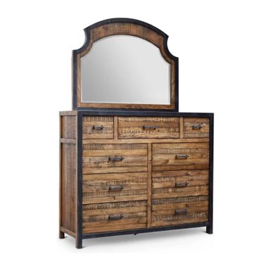 Inspired by legendary American outdoorsman Dick Idol, this handsome dresser mirror will give your bedroom a rustic touch of contemporary design. The varied tones of pine show rugged sawmark distressing, outlined with a black metal frame that gives the piece an industrial flair. This mirror makes the perfect companion for the Urban Frontier 9 Drawer Dresser. The Urban Frontier collection is the hallmark of quality craftsmanship. Please note: this product includes mirror only, dresser sold separately.