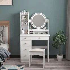 Home Makeup Dressing Table With Stool Vanity Set With Mirror & Lamp – White