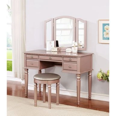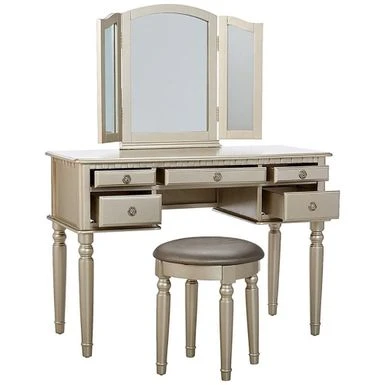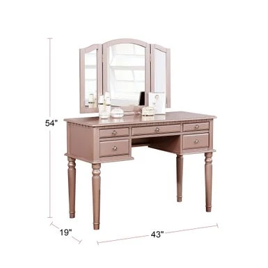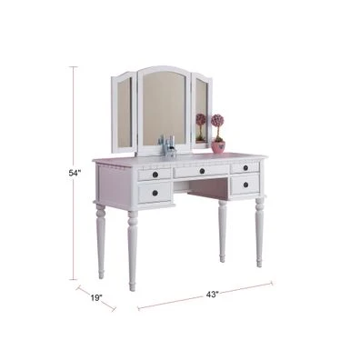 A classic look with traditional detailing, the vanity set is sure to boost your confidence on a daily day. Its crisp white finish paired with beveled accents perfectly blends old and new. A classic look with traditional detailing, the vanity set is sure to boost your confidence on a daily day. Its crisp white finish paired with beveled accents perfectly blends old and new. Feature five pull-out drawers perfect for storing all of your beauty essentials and a foldable vanity mirror to catch every angle. This vanity is a must-have for your everyday get-ready routine!