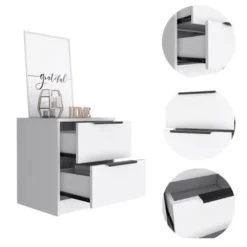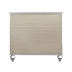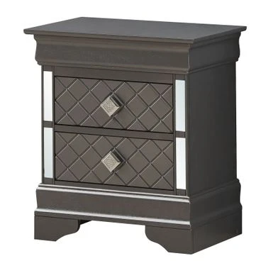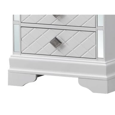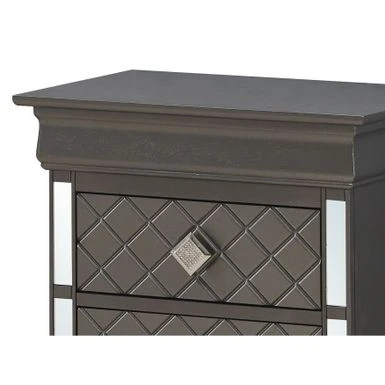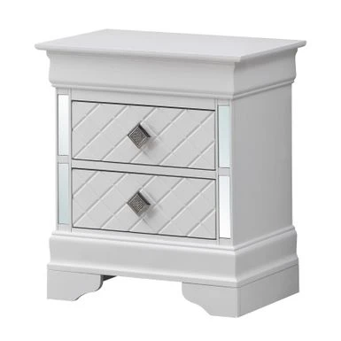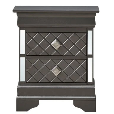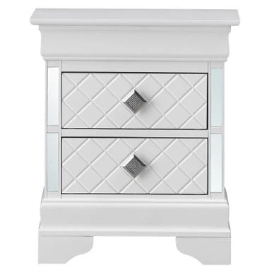 The Verona Nightstand by Glory Furniture is the definition of perfect style and function. This fully assembled bedside nightstand is finished with real wood veneers over manufactured and solid wood. The drawers feature center supported, metal glides for a smooth movement. Each drawer is dovetailed on the front and back, exuding solid construction at a value price. The drawer bottoms are supported with corner blocks for added stability. The piece boasts chrome pull hardware, mirrored edging and faux crystal details. Bring style and form to your bedroom with this beautiful nightstand.