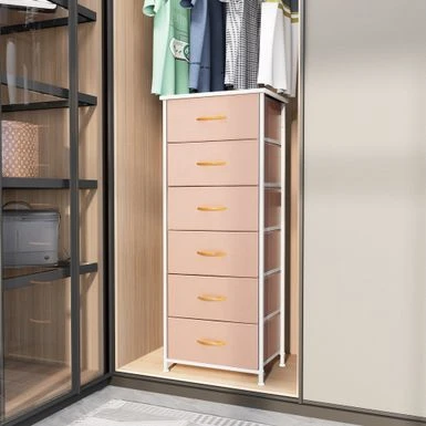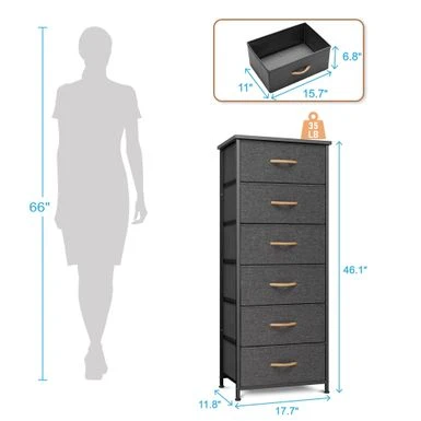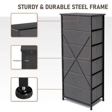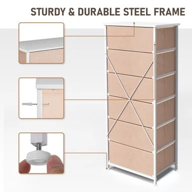 Add extra storage space to any room with the 6 drawers vertical dresser storage tower. Featuring a metal frame and a durable MDF wooden top, this dresser is both convenient and portable. Its six removable and foldable fabric drawers with wooden handles provide ample storage space for clothing, blankets, or towels. With four adjustable plastic feet that prevent scratches and adjust for uneven floors, this dresser is easy to care for and assemble. Enjoy the convenience and style of the 6 drawers vertical dresser storage tower in any room of your home.