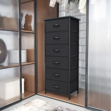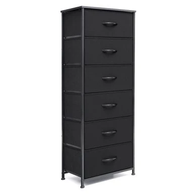 Add extra storage space to any room with the 6 drawers vertical dresser storage tower. Featuring a metal frame and a durable MDF wooden top, this dresser is both convenient and portable. Its six removable and foldable fabric drawers with wooden handles provide ample storage space for clothing, blankets, or towels. With four adjustable plastic feet that prevent scratches and adjust for uneven floors, this dresser is easy to care for and assemble. Enjoy the convenience and style of the 6 drawers vertical dresser storage tower in any room of your home.