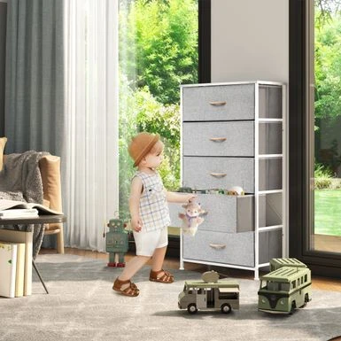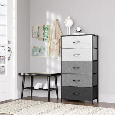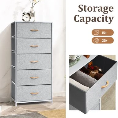 Maximize your rooms storage space with the vertical 5 drawers storage tower. This dresser is designed for convenience and easy portability, featuring a light-weight steel frame and an MDF top. Its five fabric drawers with wooden handles provide ample storage for clothes, linens, or towels, making it an excellent choice for any room that needs extra storage. Assembly is a breeze, so you can enjoy your new dresser in no time.