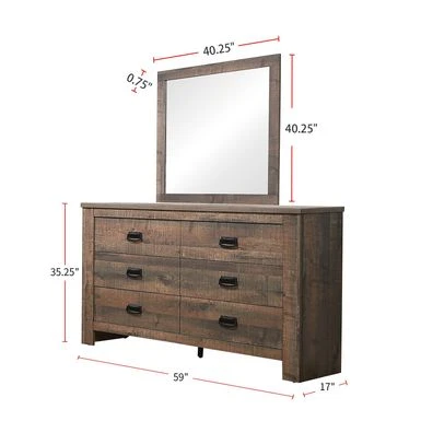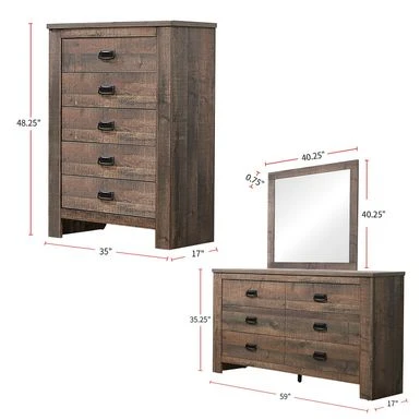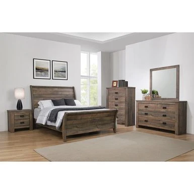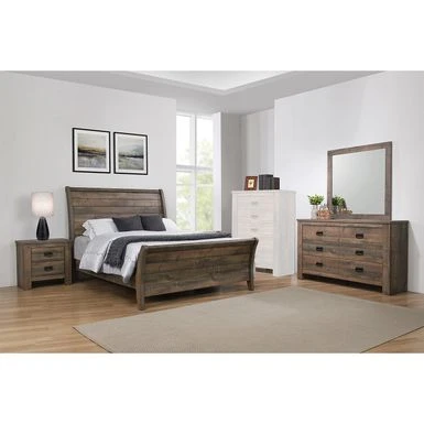 Transform your sleep space into a cozy oasis with this rustic 4-piece Wooden Queen Bedroom Set in Weathered Oak. The rich weathered oak finish with handsome wood grain details and curved, plank-style sleigh headboard and footboard create a warm and inviting atmosphere. The set includes a nightstand, dresser, and mirror, each featuring solid wood legs and drawers with bail handles in a dark bronze finish. Create a majestic retreat in your bedroom with this exclusive design.