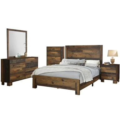 A lush rustic pine finish delivers a repurposed wood look and the earthy elegance sought in a casual, nature-inspired bedroom ensemble, making this bedroom set a perfect choice for a contemporary space. A lush rustic pine finish delivers a repurposed wood look and the earthy elegance sought in a casual, nature-inspired bedroom ensemble, making this bedroom set a perfect choice for a contemporary space. Finish gradations stand out in a platform bed with a tall boxed headboard at the center, surrounded by a dresser, nightstand, and mirror. Strive for a cabin motif in this contemporary set with dark bronze matte metal hardware and linear styling. Finished drawer boxes with front and rear English dovetail construction and center drawer glide ensure smooth operation, as drawer space is plentiful in creating room for essentials.