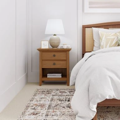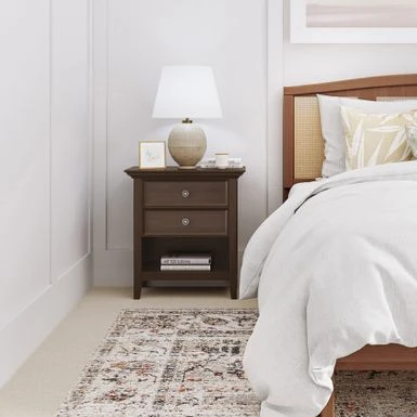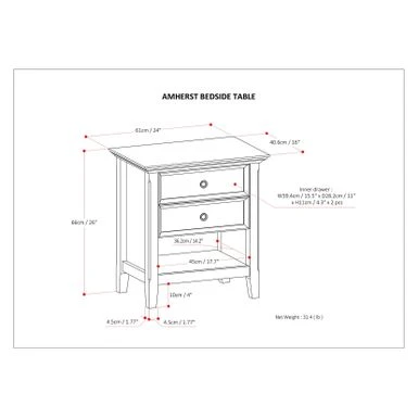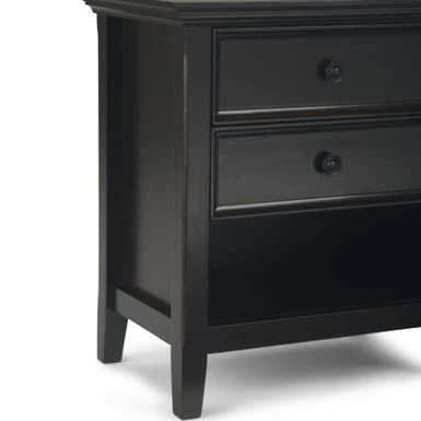 Upgrade your bedroom dcor with the Halifax Bedside Table. Crafted from premium solid wood and hand-finished with protective NC lacquer coating, this nightstand is a durable and stylish addition to your home. With two drawers for concealed storage and an open bottom shelf, it’s perfect for holding all of your bedtime essentials. The unique design features tapered legs, molded crown edged table top, panel framed drawer fronts, and bronze round decorative pulls, making this piece as beautiful as it is functional.