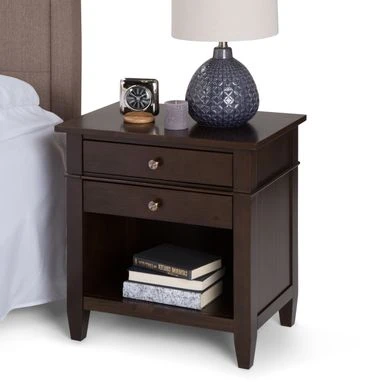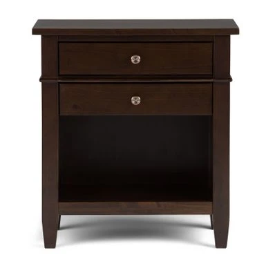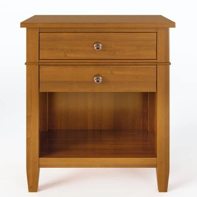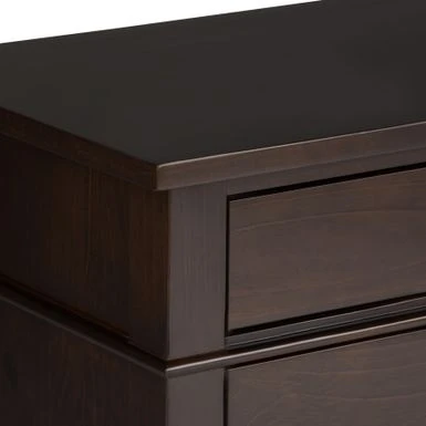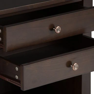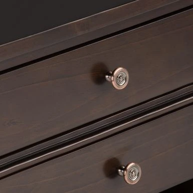 - Includes antique bronze rounded decorative knobs and metal drawer glides